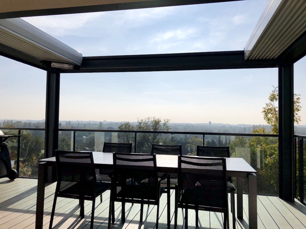 Idéale pour les grandes terrasses (30 à 40 m² et plus), la Hauteval peut être configurée sur-mesure avec motorisation Somfy, capteurs météo, module solaire autonome, stores ZIP, éclairage LED ou chauffage intégré.